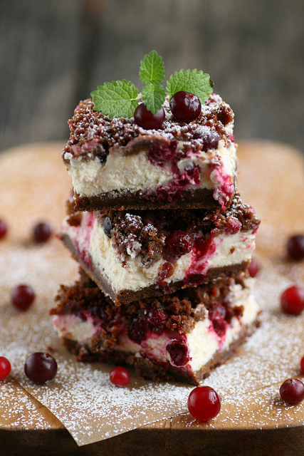 Preheat oven to 200 C. Line the bottom of the square (22 cm) springform pan with baking parchment. For gingerbread crumble, crush the gingerbread and mix with melted butter. Press 2/3 of the crumble into the bottom of the pan. In a separate bowl, mix the cheese curd with sugar, and add sour cream and slightly beaten eggs. Pour it over the crust. Add cranberries. Sprinkle the remaining gingerbread crust evenly over cranberries. Bake for 30 minutes. Serve cooled.