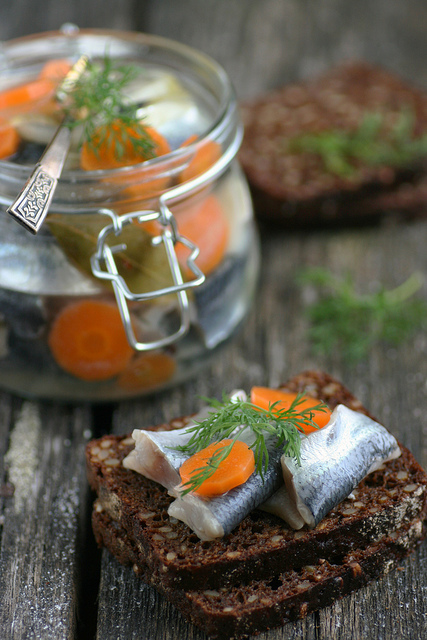 Bring water, salt, sugar, onion and carrot slices, and all spices to boil. Let it simmer for about 5 minutes, then remove from heat and add vinegar. Layer fish fillets in a glass jar, pour the cooled pickling liquid over them and seal the jar. Let it stay in the fridge at least a day before eating.
