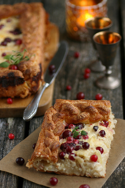 Fry bacon on the bottom of the pan, add sauerkraut and stock, season with salt and sugar and let cook until the sauerkraut is soft (approx. 45 min). Preheat the oven to 200 C. Press the dough into the bottom and sides of the pie pan and spread the sauerkraut filling onto the bottom. Beat eggs slightly, add whipping cream and pour over the sauerkraut filling. Add cranberries. With the remaining dough, make a braided edge to the pie. Bake for 35-40 minutes.