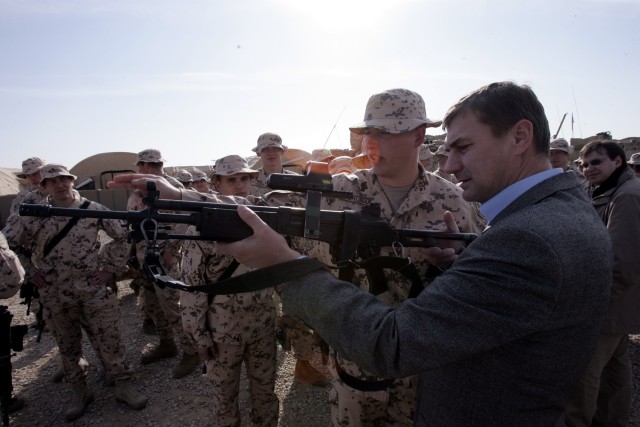 Estonian Prime Minister Andrus Ansip explores a gun on his visit to the Estonian mission in Afghanistan. Image: Raigo Pajula / Scanpix